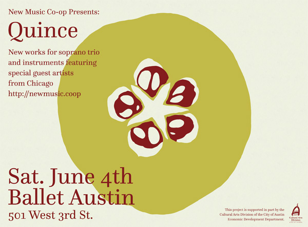 NMC Presents: Quince For our third concert focused on vocal music, NMC is thrilled to present special guest artists the Quince Ensemble. Having recently returned from a performance in Poland with David Lang (Bang on a Can), this adventurous trio of vocalists is headed for Texas to premiere four new works by NMC composers. Quince singers Elizabeth Pearse (soprano), Kayleigh Butcher (mezzo soprano) and Carrie Henneman Shaw (soprano) have made a name for themselves by tackling unique musical challenges and performing genre-bending contemporary repertoire. After an incredibly successful outing with "Convergence" vocal quartet which netted an Austin Critics Table award for "Best Vocal Performance" in 2012, NMC composers Laura Brackney, Brent Fariss, Andrew Stoltz, and Travis Weller can't wait to hear their new vocal works brought to life by this world class trio. About the Program Brent Fariss' "Three Angels" is scored for two bass flutes, trombone, vibraphone and three singers with text contributed by Swedish conceptual artist Leif Elggren. Laura Brackney brings her minimalist a cappella work "Consecutive Motion" for three voices. "Winter Scenes" by Travis Weller explores pure tones using cello, bowed microtonal steel bells, and three voices, with text by Dorothy Meiburg Weller. Andrew Stoltz' piece for three vocalists with vibraphone, bass drum, chimes, cello, and invented string instrument "The owl" explores personal history. All four compositions were written for the Quince Ensemble. About the Quince Ensemble With the precision and flexibility of modern chamber musicians, Quince Contemporary Vocal Ensemble specializes in experimental repertoire that is changing the paradigm of contemporary vocal music. Described as "a new force of vocal excellence and innovation" by The Brooklyn Rail, Quince continually pushes the boundaries of traditional vocal ensemble literature. As dedicated advocates of new music, Quince regularly commissions new works, providing a wider exposure for the music of living composers, and supports the efforts of concert series and universities who strive to incorporate contemporary repertoire into their programming. Quince has recently been seen on Vicky Chow's Contagious Sounds Series, a.per.io.dic's John Cage Festival in Chicago, on the Philip Glass: Music with Friends benefit concert at the Issue Project Room in Brooklyn, the Bemis Center for Contemporary Arts in Omaha, NE, and the Codes Festival in Lublin, Poland. More info: http://www.quince-ensemble.com/ Parking information Attendees are welcome to park in the Austin City Hall parking garage (at Cesar Chavez and Lavaca St). Ballet Austin is about two blocks west (3rd and Nueces). We will validate up to two hours of parking in this garage. There are other garages and pay lots nearby, but rates will vary. Please note there is no parking available at the venue itself. Construction sites nearby will make finding street parking very difficult. About Austin New Music Co-op New Music Co-op is a community of composers and performers from the Austin area dedicated to promoting awareness and understanding of new music. Since 2001 NMC has presented almost 50 concerts featuring close to 200 new works, many of them premieres. Notable New Music Co-op concerts have included two collaborations with Ellen Fullman and her Long String Instrument, the first complete US performance of Cornelius Cardew's seven-hour epic, The Great Learning, a commission of a program-length work by Berlin-based composer Arnold Dreyblatt, a realization of John Cage's Song Books, music for the extinct instruments of Luigi Russolo, Pauline Oliveros' Four Meditations for Orchestra (with the composer in attendance), and a three-day series of the works of the New York School. The Co-op was named "Outstanding Classical Ensemble" for 2011-2012 by the Austin Critics' Table. The New Music Co-op is a 501(c)(3) non-profit organization, and all donations to the group are tax-deductible. This project is supported in part by the Cultural Arts Division of the City of Austin Economic Development Department.